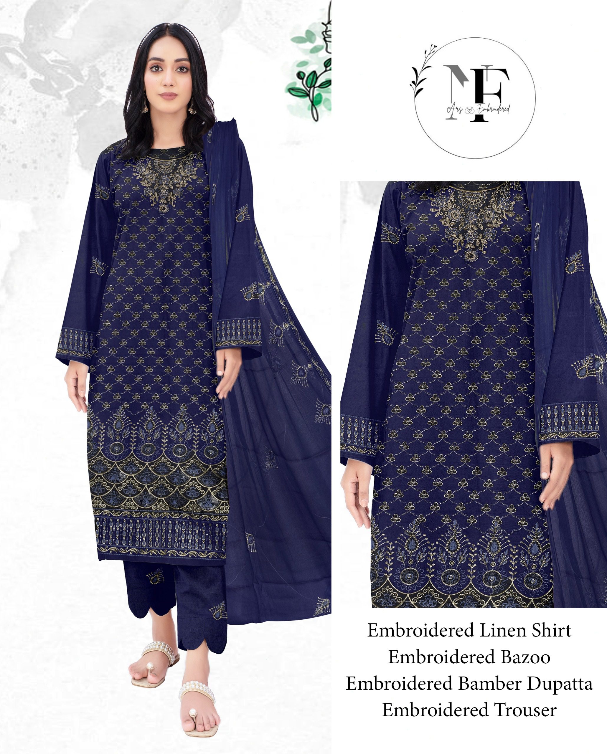 Embroidered Linen 4 PCS (Unstitched) Suit Dark Blue
