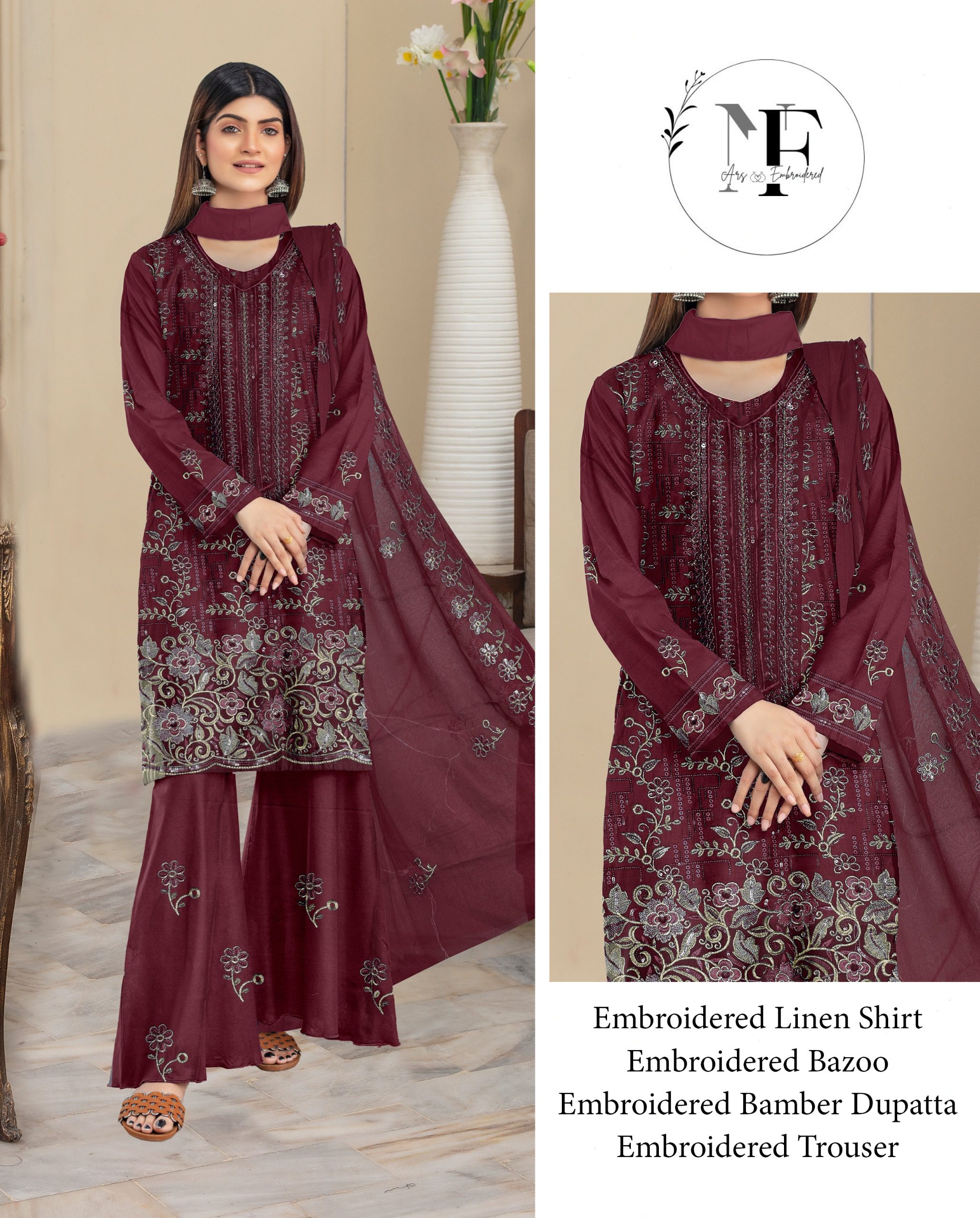 Embroidered Linen 4 PCS (Unstitched) Suit Dark Maroon