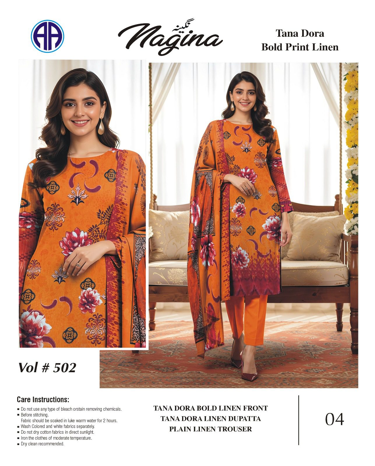 Tana Dora Bold Print Linen 3 PCS (Unstitched) Orange